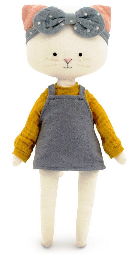 Высота игрушки 30 см. Кошечка Кристи - самая нежная кошечка на свете. Она обожает обниматься и просто замурррчательно умеет петь колыбельные песенки. Кристи одета в муслиновую кофточку горчичного цвета и милый сарафанчик на лямках. На голове маленькая повязка-бант в горошек. Одежда выполнена из 100% натурального хлопка и полностью съемная.