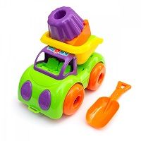 В составе песочного набора - машинка, три формочки и совочек.